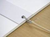 吊り金具を取り付けます。 吊り金具の取り付け位置は、接合プレートの穴のところと、パネルの左右になります。 パネル左右の吊り金具取り付け位置は、パネルのフチから10センチくらいのところが適当ですが、会場のご都合に合わせて調整してください。 まずパネルの裏面から鉛筆や釘で、表に鉛筆の先が出るくらいまで穴をあけ、次に今度はオモテ面から穴に鉛筆を差し込んで穴の大きさを調整します。 その穴に釣り金具を取り付けます。